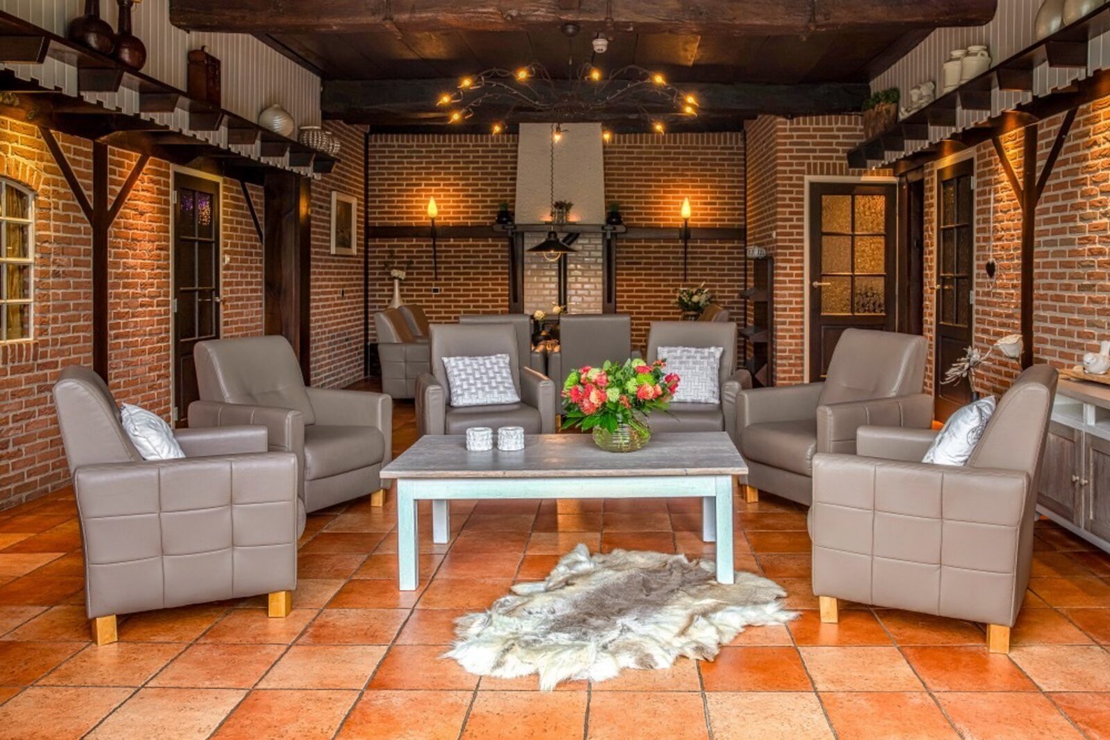Woonkamer met authentieke elementen. Er zijn twee zithoeken met houtkachel, schaaktafel en flatscreen tv.
