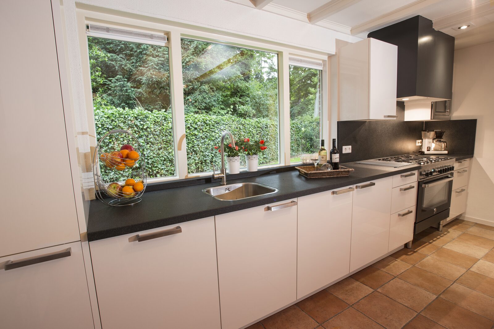 Aparte moderne keuken met 5 gaspitten, grote koelkast en vriesvak, oven, vaatwasser, waterkoker en koffiezetapparaat.