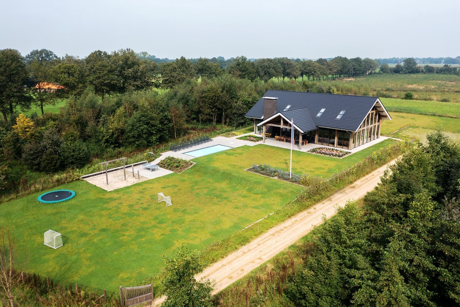 De Achterhoek staat bekend als verrassend veelzijdig en dat bewijst niet alleen de prachtige omgeving, maar zeker ook dit huis. Het landhuis is recent gebouwd en is van alle gemakken voorzien met een verwarmd buitenzwembad, sauna, fitness, speelvoorzieningen binnen en buiten en open haard. De grote ramen geven het gevoel van buiten leven en met een voet sta je midden in de natuur. Je kijkt uit op landerijen, weilanden en bomen en je hoort alleen de geluiden uit de natuur van loeiende koeien, kwetterende vogels en een wegspringende ree. Het is er heerlijk rustig, kom onthaasten in de Achterhoek.