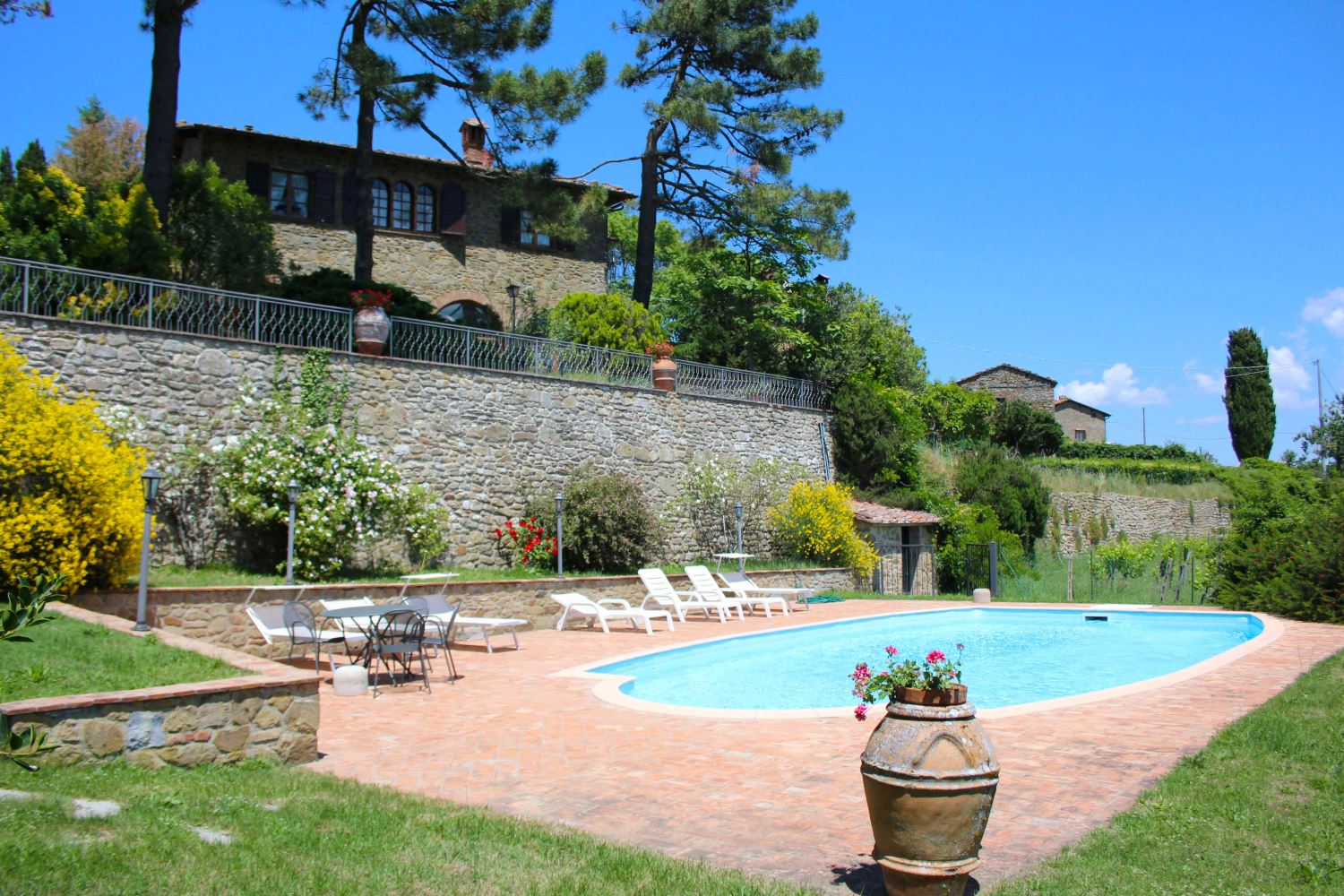 Halverwege Siena en Arezzo ligt dit karaktervolle vakantiehuis met privé zwembad en prachtige, omheinde tuin. Het bevindt zich aan de rand van het gehuchtje Palazzuolo en is een ideale uitvalsbasis voor het verkennen van dit fraaie deel van Toscane. U heeft een weids uitzicht over de vallei en het beboste heuvellandschap. Op warme dagen is het goed toeven op de schaduwrijke loggia, een fijne plek om de maaltijden te gebruiken. Het royale zwembad ligt op een lager niveau en is omringd door zonneterrassen. De ruime villa heeft twee zitkamers, een grote keuken, drie slaapkamers en drie badkamers. In een dependance, op slecht een paar meter van de villa, bevinden zich een slaapkamer en een badkamer (hier is geen verwarming). Op loopafstand is een restaurant, in Monte San Savino kunt u terecht voor alle boodschappen en er zijn meerdere restaurantjes en cafés. Het oude stadje is rijk aan historie en telt nog heel wat gebouwen uit de Middeleeuwen en de Renaissance. Siena en Arezzo bereikt u in ongeveer een half uur en zelfs een bezoek aan de wat verder gelegen steden Perugia en Florence behoort tot de mogelijkheden. Ook is het aardig eens een dagje door te brengen in het wijnstadje Montepulciano, het heeft een prachtig middeleeuws centrum met vele “palazzi”, kerken, antiekwinkels en kunstgalerijen en overal kunt u de bekende wijn van de streek, de Vino Nobile, proeven.