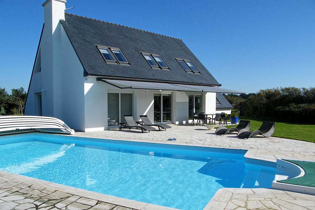 Geheel vrijstaand vakantiehuis met privé zwembad bij Trégunc op slechts 500 m van zee, 10 km ten zuidoosten van Concarneau aan de zuidkust van Bretagne. Het uitstekend ingerichte huis is heerlijk rustig gelegen op een groot omheind terrein, grenzend aan landerijen. Vanuit het huis en vanuit de tuin ziet u de zee. In enkele minuten wandelt u naar het prachtige zandstrand van Kerouiny. Hier begint ook meteen de GR 34, de wandelroute die u langs de oceaan voert. Een plus is het fraaie zwembad, waarvan u ook in het voor- en naseizoen volop kunt profiteren vanwege de (automatisch aangedreven) overkapping. In Trévignon (4 km) zijn bij het haventje een aantal restaurants en wat cafeetjes. U kunt er genieten van een prachtig uitzicht op zee. Alle boodschappen kunt u doen in Trégunc (6 km) , hier is ook een grote supermarkt. De ligging van het vakantiehuis is ideaal voor het verkennen van zowel de kust als het achterland van de zuid-Finistere. Concarneau met het prachtige, ommuurde oude centrum (Ville Close) ligt op 10 km, in de gezellige havenstad vindt u talrijke restaurants en terrasjes. Het pittoreske Pont-Aven is bekend geworden door de schilder Paul Gaugain. Het stadje heeft vele galerieën en leuke winkeltjes. Ook de stad Quimper met z’n kathedraal en sfeervolle binnenstad is zeker een bezoek waard.