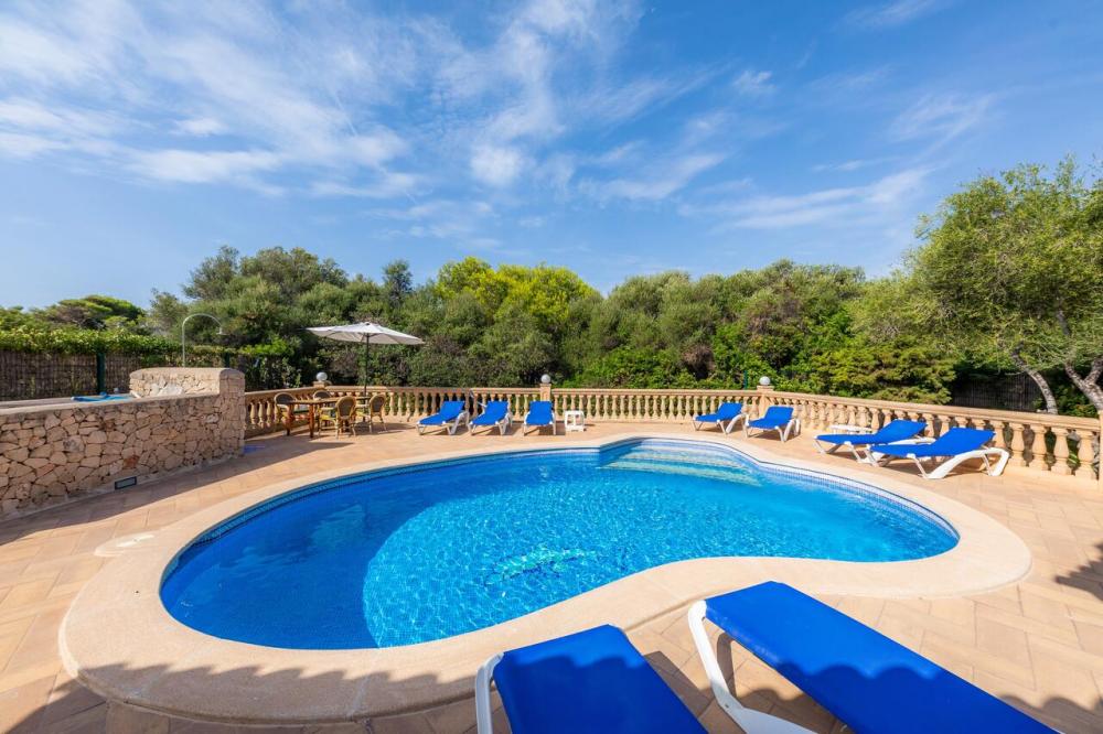 De villa heeft een mooi overdekt terras met ingebouwde barbecue, tafel en stoelen, waar u kunt genieten van een al fresco maaltijd of gewoon relaxen met uitzicht op het zwembad. Het mooie niervormige zwembad is omgeven door een terras met ligbedden om te zonnen en een open buitendouche. Het terras is omgeven door struiken voor prive zonnebaden. Grasveld aan de voorzijde en zijkant van het huis.
