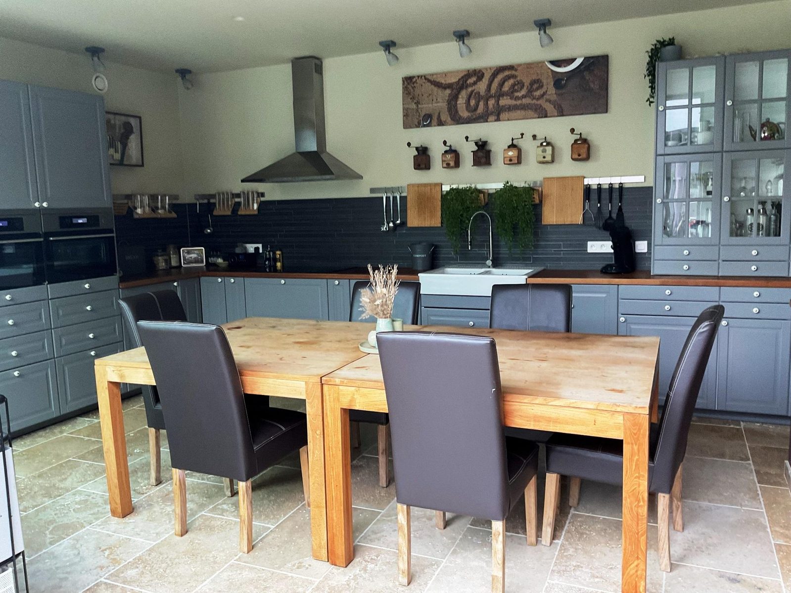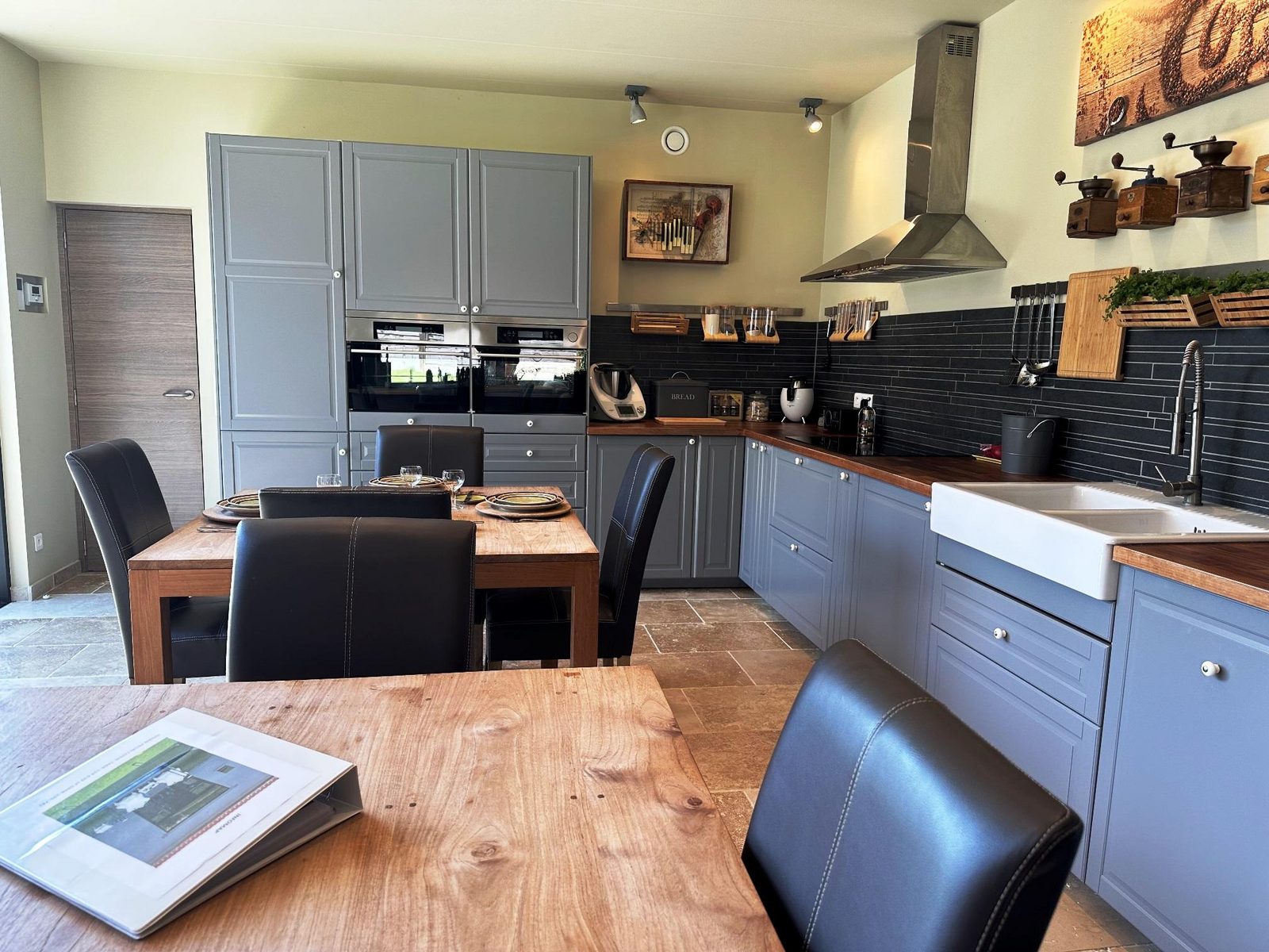 Open keuken met keramische kookplaat, grote koelkast met vriezer (3 lades), vaatwasser, combi-oven (hetelucht/stoom), combi-magnetron, Senseo, waterkoker, airfryer, pizzamaker.