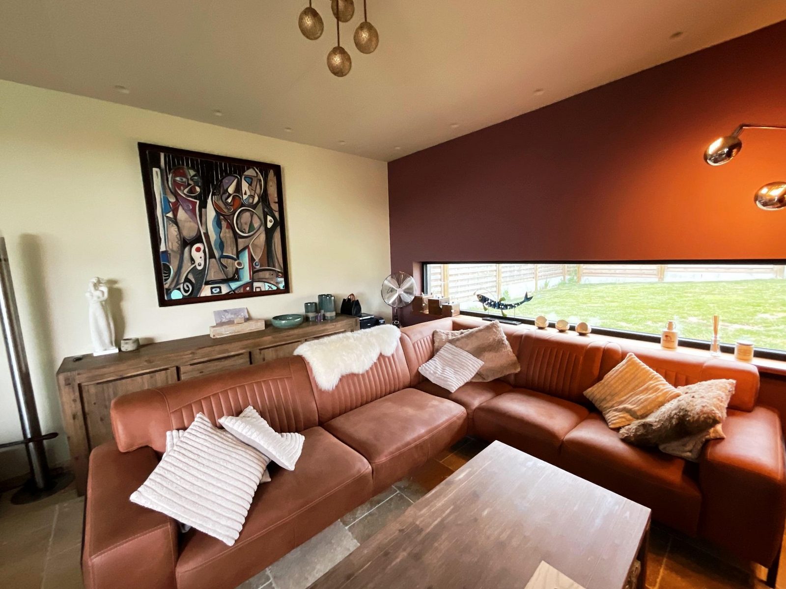 Woonkamer met zitgedeelte en smart-tv/dvd.
