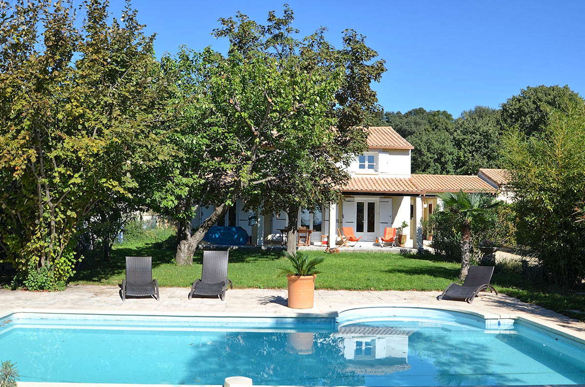 Ruim vakantiehuis met een groot privé zwembad op ruim 2 km van het dorp leuke Quissac, 34 km ten westen van Nîmes. Het huis, waarvan zich alle vertrekken op de begane grond bevinden, ligt in een gehuchtje bij het dorpje Liouc op een royaal, geheel ommuurd terrein. Op het grasveld voor het huis kunnen kinderen naar hartelust spelen en het zwembad, dat gezuiverd wordt d.m.v. electrolyse van zout, is beveiligd met een goede omheining. Liouc ligt in een mooie, heuvelachtige omgeving met veel wijngaarden en bossen. Voor alle boodschappen, cafés en restaurants kunt u terecht in Quissac, op slechts 1,5 km is al een supermarkt. De ligging is ideaal voor het verkennen van de afwisselende streek. Zowel het ruige berggebied van de Cevennen als de kust van de Middellandse Zee zijn goed te bereiken. Aan de voet van de Cevennen liggen karakteristieke plaatsjes als Sauve, Saint-Hippolyte-du-Fort, Saint-Jean-du-Gard en Anduze. De zandstranden bij La Grande Motte bevinden zich op 47 km en zijn goed te bereiken. Een bezoek aan het ommuurde plaatsje Aigues-Mortes met de indrukwekkende vestingtorens is zeer de moeite waard en uitstekend te combineren met een tocht door de Camargue. Ook op cultureel gebied valt er het één en ander te beleven. Zowel Nîmes als Montpellier zijn levendige, bezienswaardige steden en mogen niet op het programma ontbreken, evenals de beroemde Pont-du-Gard bij Uzès.